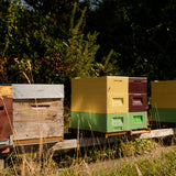 Nous avons environ 400 ruches en production. Trois cents d'entres elles se trouvent dans des ruchers sédentaires autour de Bayeux, Caen et en Suisse Normande.Le reste de nos ruches partent en transhumance d'avril à septembre pour la production de miels monofloraux (voir fiche produit) En hiver, toutes nos ruches rejoignent le Calvados.